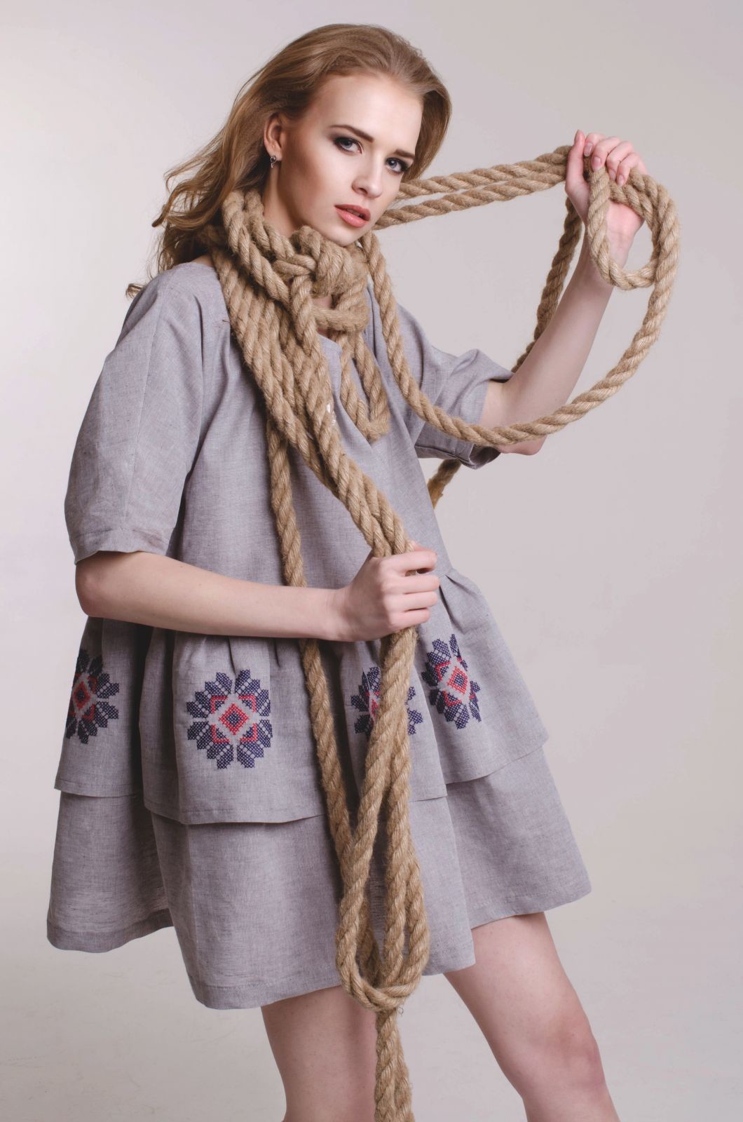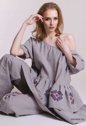 На этом платье Адель вышит этнический мотив, который наиболее популярен среди наших покупательниц. У него есть особая сила – это символ защиты и непрерывности жизни. Платье идеально сочетается с брюками изо льна.