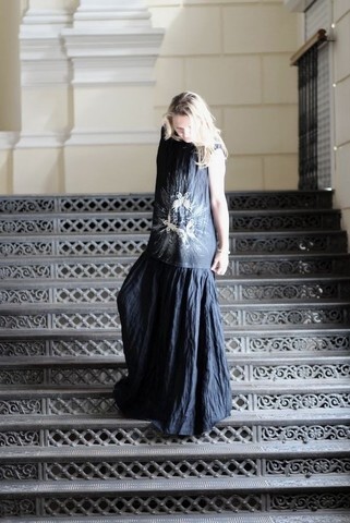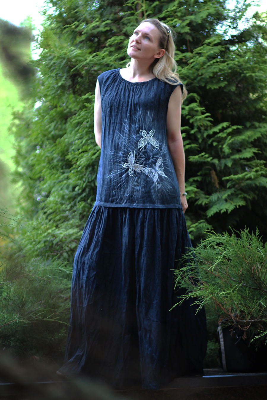 Платье Алла в "Льняном сундучке". Длина в пол из натурального льна. Цвет ткани – ночное небо. Вышивка в виде бабочек дополнена тонировкой. Игра c фактурой, цветом, декором делает платье очень эффектным.