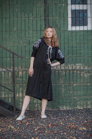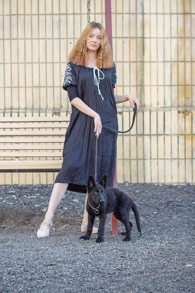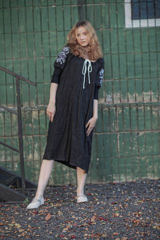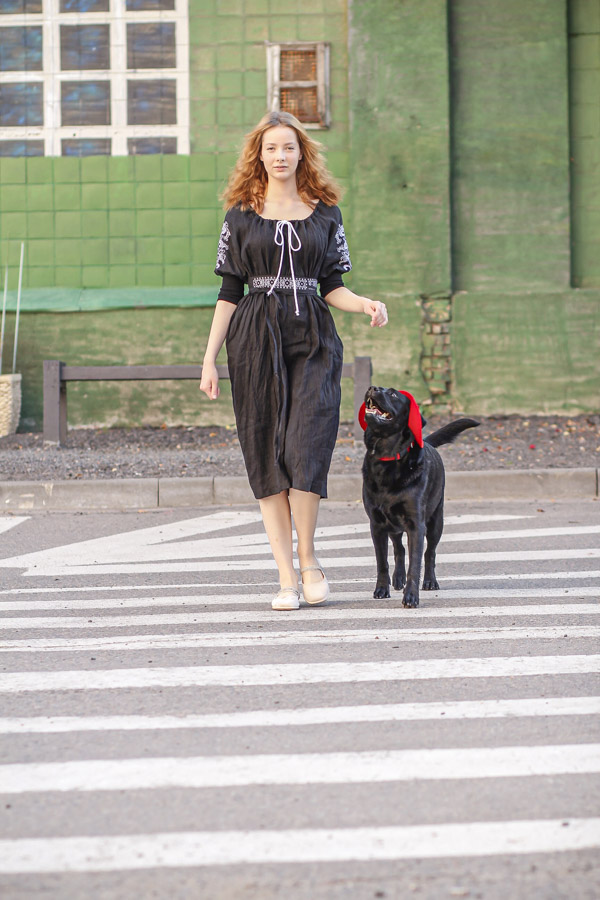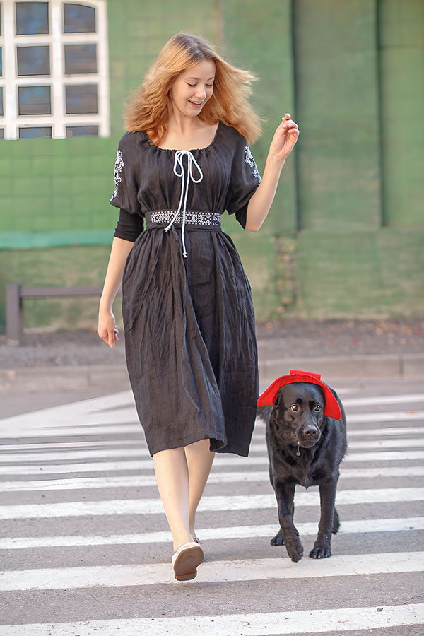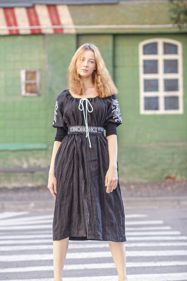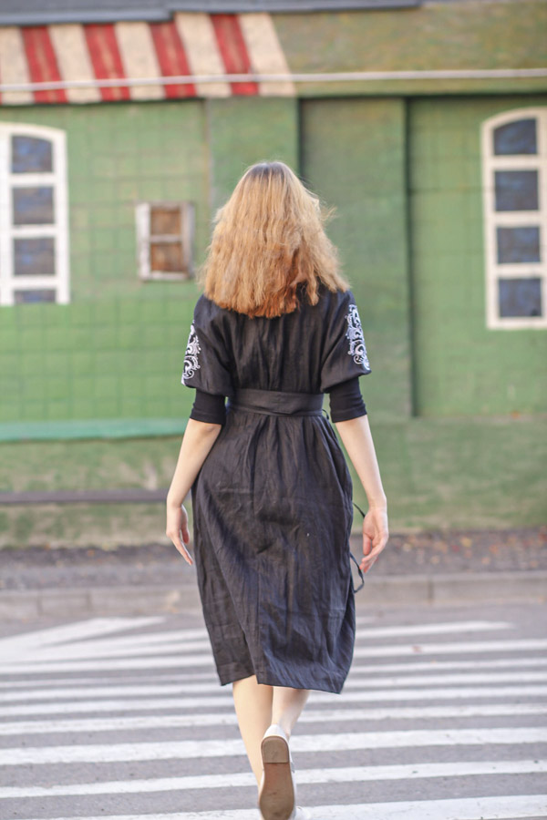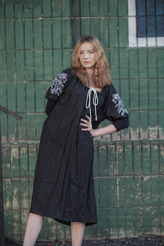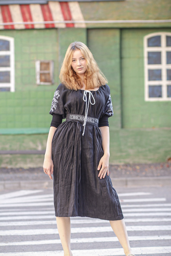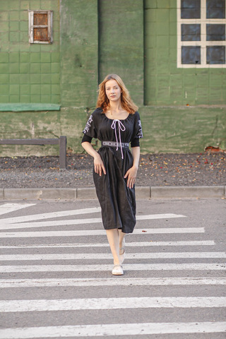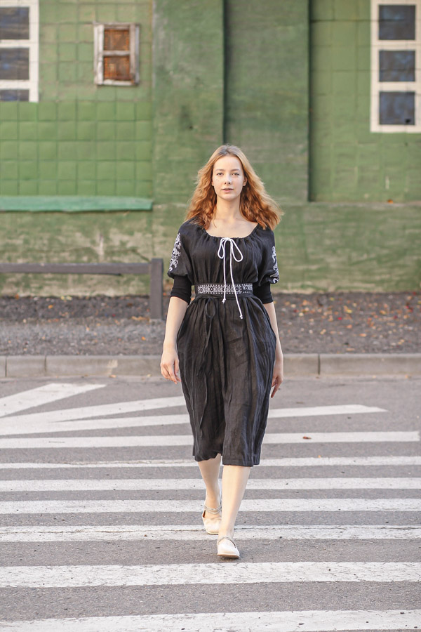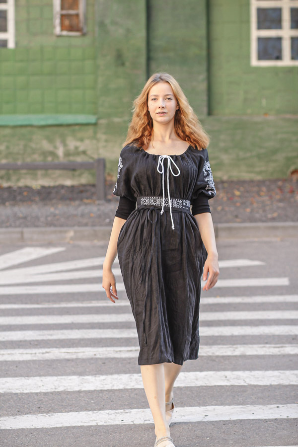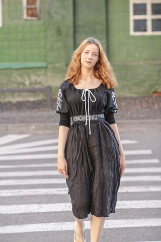 Авторское платье Ксения в "Льняном сундучке" из черного натурального льна с рукавом 3/4, весьма удобно и уместно в любой ситуации. Вышивка на рукавах -яркий акцент. Пояс с вышивкой подчеркнет талию. Манжеты из трикотажного полотна. Платье сочетает в себе максимальную простоту и женственность.