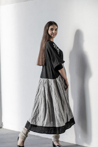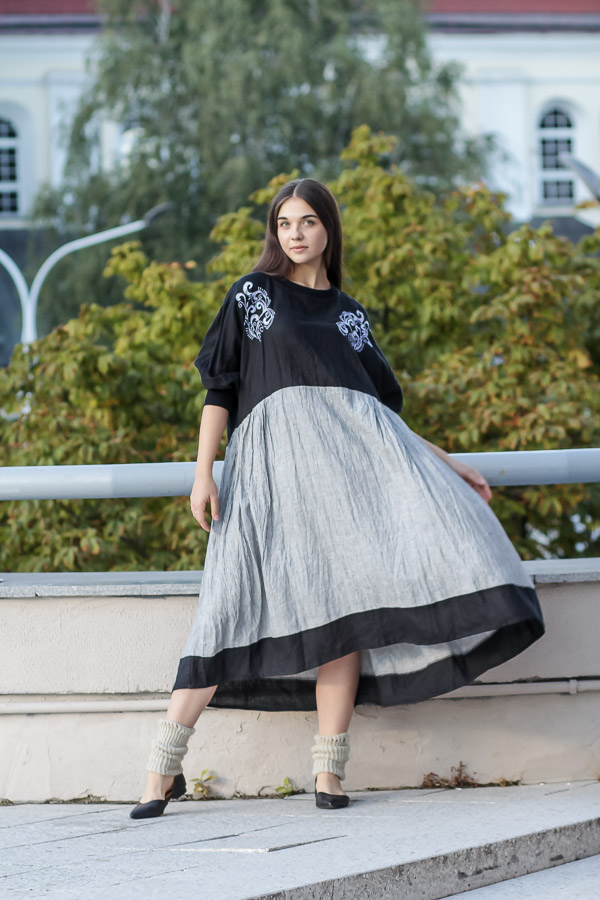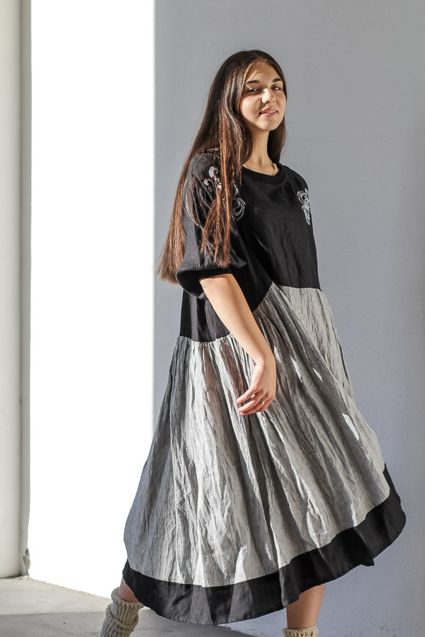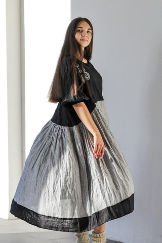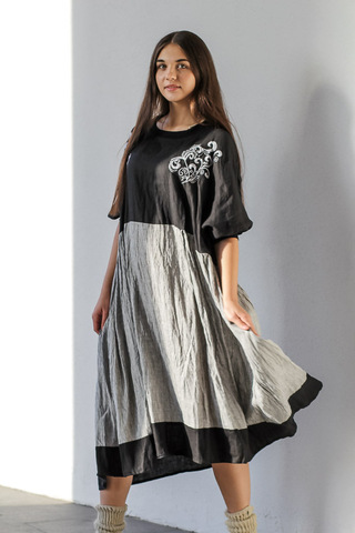 Платье рекомендовано для младшей и средней возрастных групп, выполнено из комбинированной натуральной льняной ткани. Платье женское. Силуэт-трапеция с расклешением от линии груди.