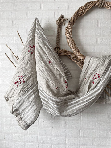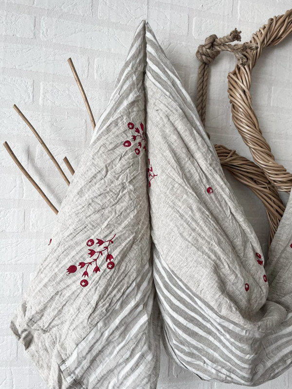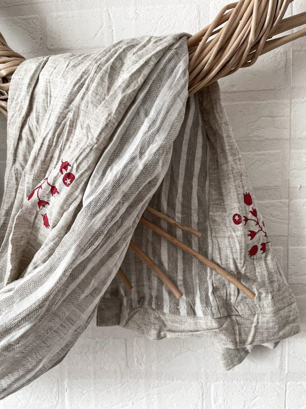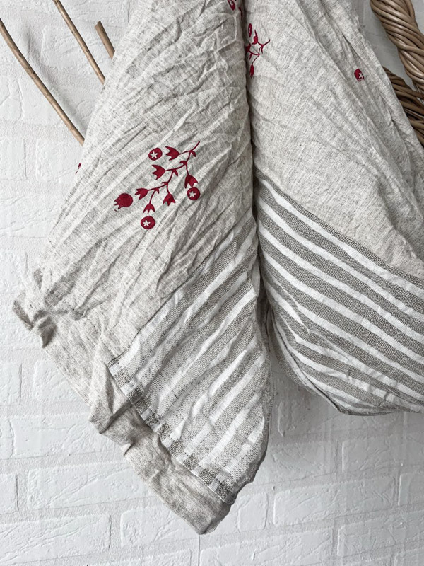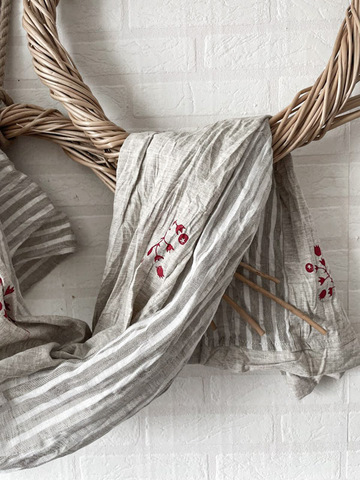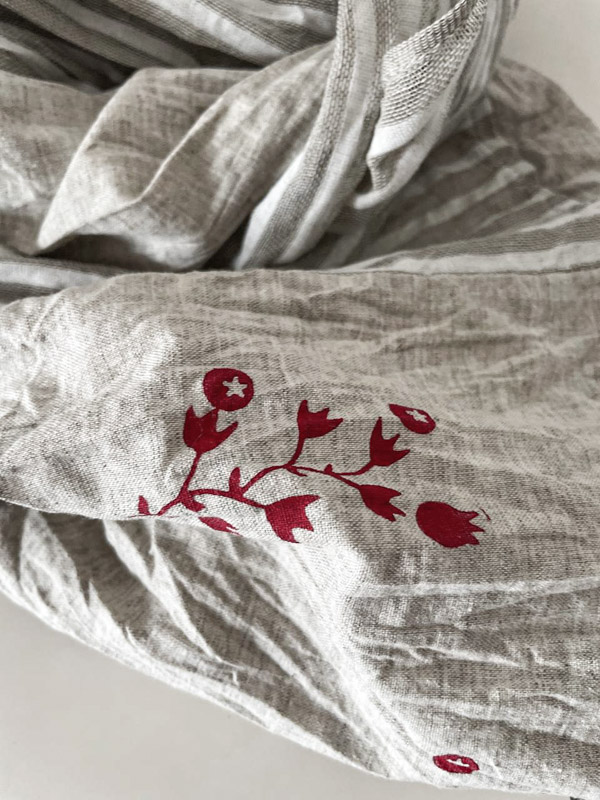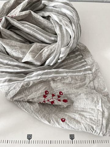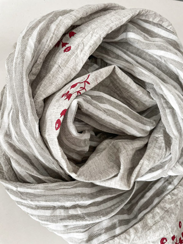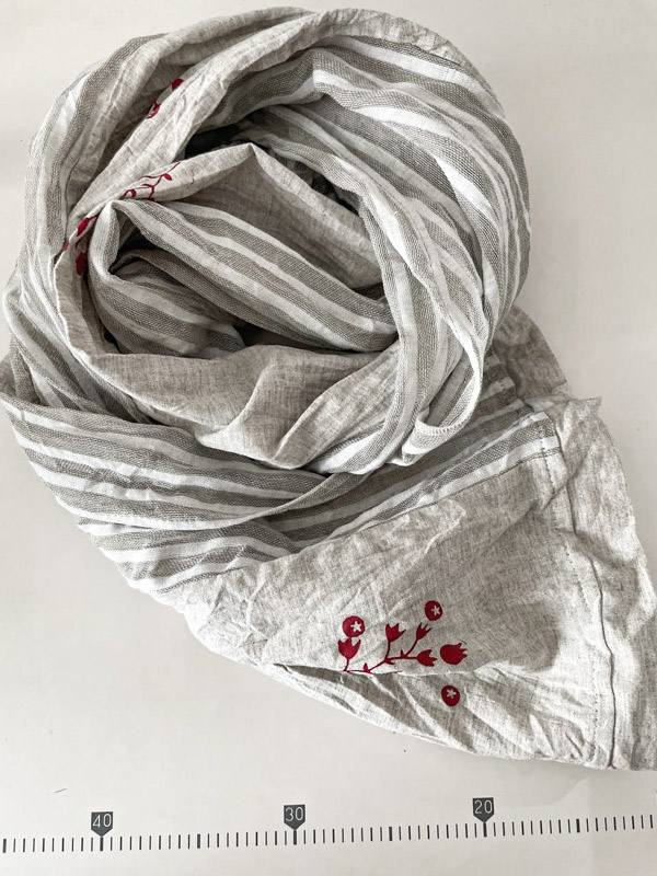 Авторская модель шарфа от марки LinenBy, выполнена из натурального материала. Вставки из замечательной, лёгкой тонкой, полупрозрачной льняной ткани с добавлением хлопка в узкую продольную полоску светло-серого цвета. Ярким декором в модели является ручная печать штампами на ткани, который освежает образ и делает Вас уникальной обладательницей авторской вещи.