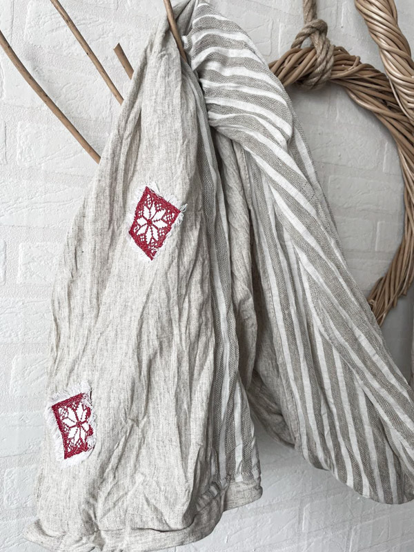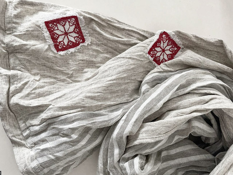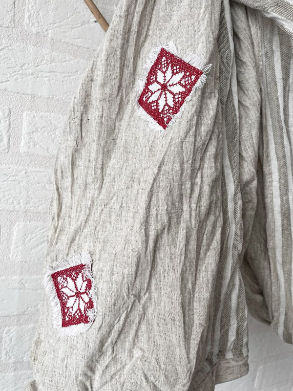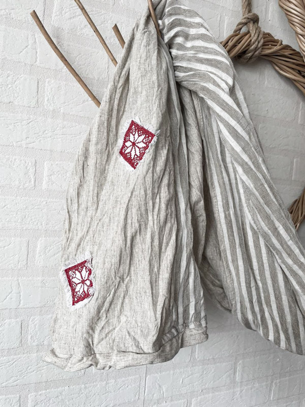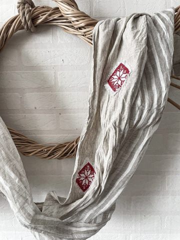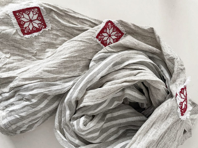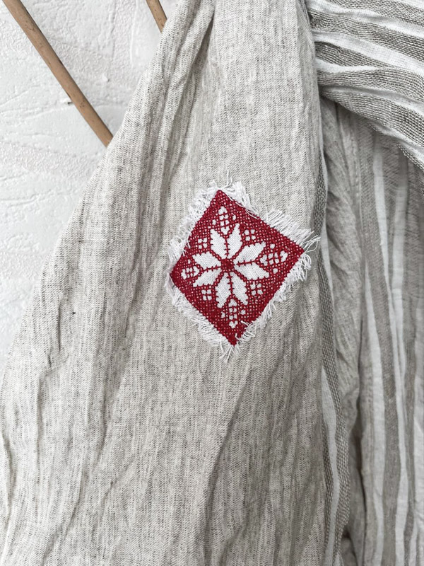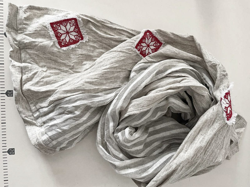 Авторская модель шарфа от марки LinenBy, выполнена из натурального  материала. Вставки из замечательной, лёгкой тонкой, полупрозрачной льняной ткани с добавлением хлопка в узкую продольную полоску светло-серого цвета. Ярким декором в модели является аппликация с вышивкой- геометрический орнамент в этностиле, который освежает образ и делает Вас уникальной обладательницей авторской вещи.