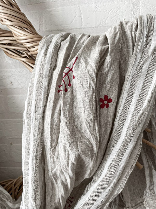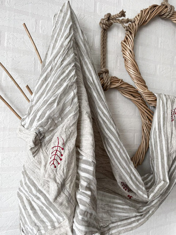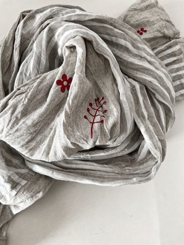 Авторская модель шарфа от марки LinenBy, выполнена из натурального  материала, идеально справляется с этой задачей. Вставки из замечательной, лёгкой тонкой, полупрозрачной льняной ткани с добавлением хлопка в узкую продольную полоску светло-серого цвета. Ярким декором в модели является ручная печать штампами на ткани, которая освежает образ и делает Вас уникальной обладательницей авторской вещи.
