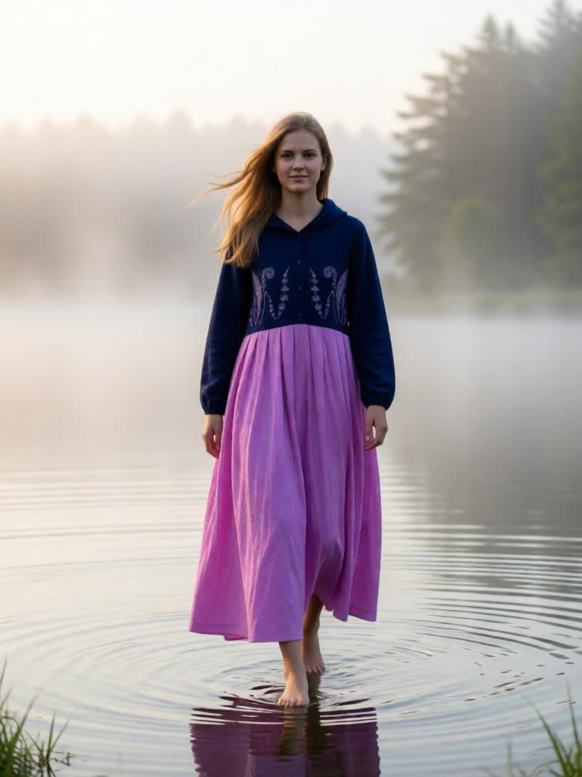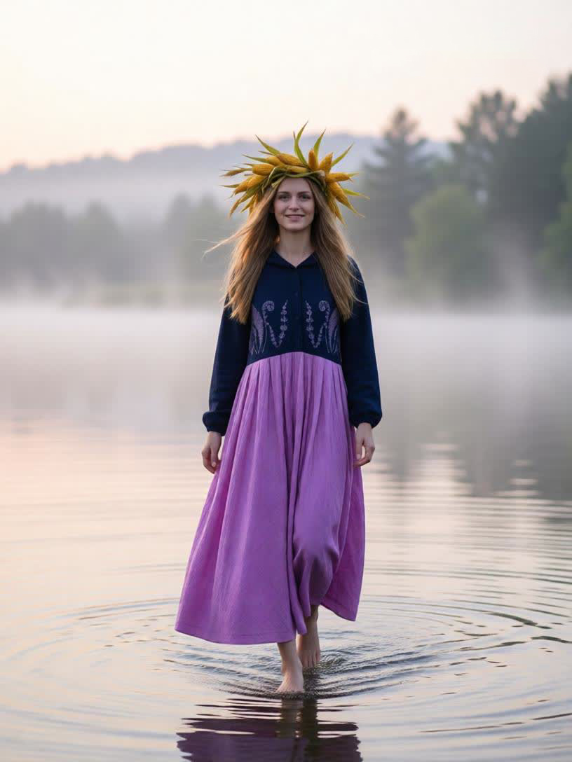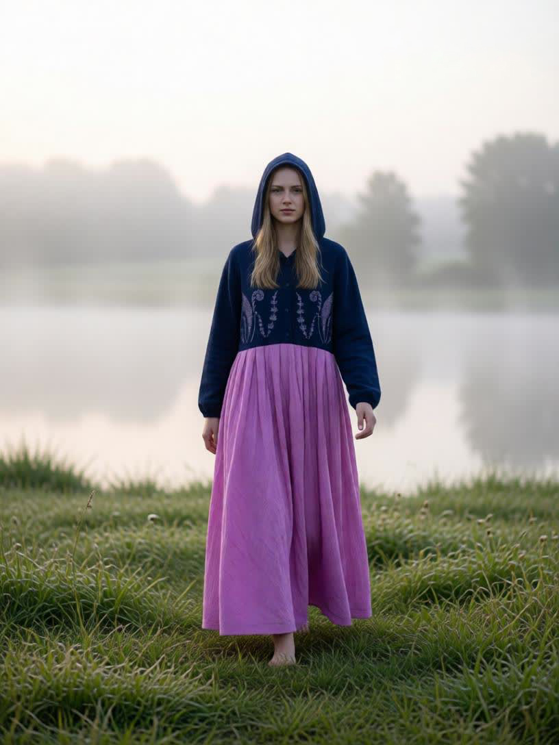 Платье Таямница в "Льняном сундучке". Длина платья макси. Платье свободного покроя с флоральной вышивкой на груди. Застежка на кнопки. По низу рукава сборка на эластичную тесьму. Капюшон. Платье идеально подходит для отдыха, путешествия или прогулки.