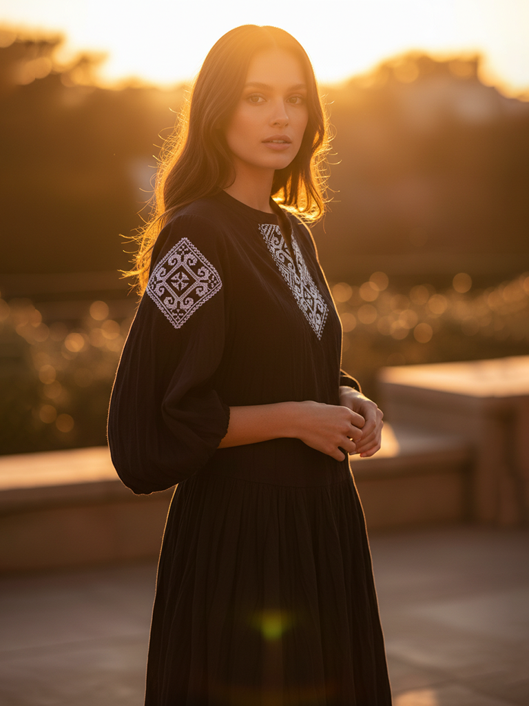 Льняное платье Ванда в этническом стиле из коллекции "Белы крыж". Платье темно-синего цвета. Длина-миди. Рукав 3/4, втачной, расширен к низу на сборку. Декор в виде вышивки- геометрический орнамент на груди и рукавах. Современный фасон с элементами народного костюма станет любимой изюминкой в вашем гардеробе.